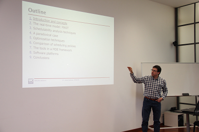 During the visit of Professor J. Javier Gutiérrez, he took the opportunity to give a distinguished series seminar on "The event-driven approach in the development of distributed real-time systems". During his talk, he addressed some of the main schedulability analysis and optimization techniques for distributed real-time systems, together with the modeling framework MAST (Modeling and Analysis Suite for Real-Time Applications) and its integration in a Model-Driven Engineering (MDE) strategy.